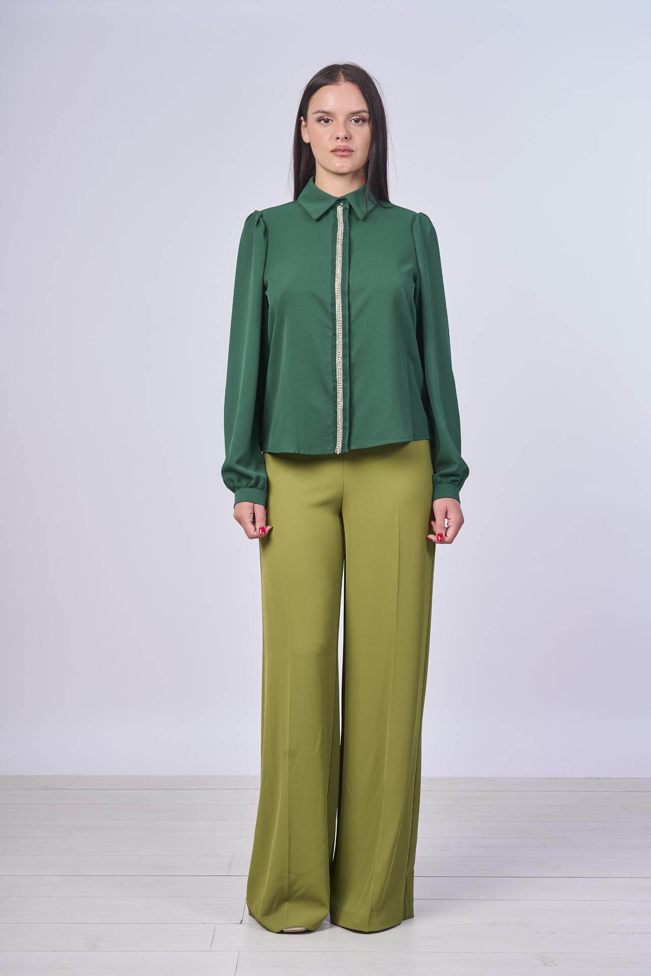 Eleva il tuo stile con questa elegante e particolare camicia verde smeraldo. Caratterizzata da una chiusura a zip con decorazione in strass, questa blusa offre un tocco glamour che la rende perfetta per ogni occasione, sia formale che casual. Le maniche lunghe a sbuffo con polsino stretto aggiungono un dettaglio chic e sofisticato. Il tessuto liscio e fluido garantisce una vestibilità comoda e un look raffinato. Ideale per esaltare la tua femminilità, questa camicia è un capo versatile che può essere abbinato a pantaloni a vita alta per un outfit da ufficio o a un paio di jeans per un’uscita serale.